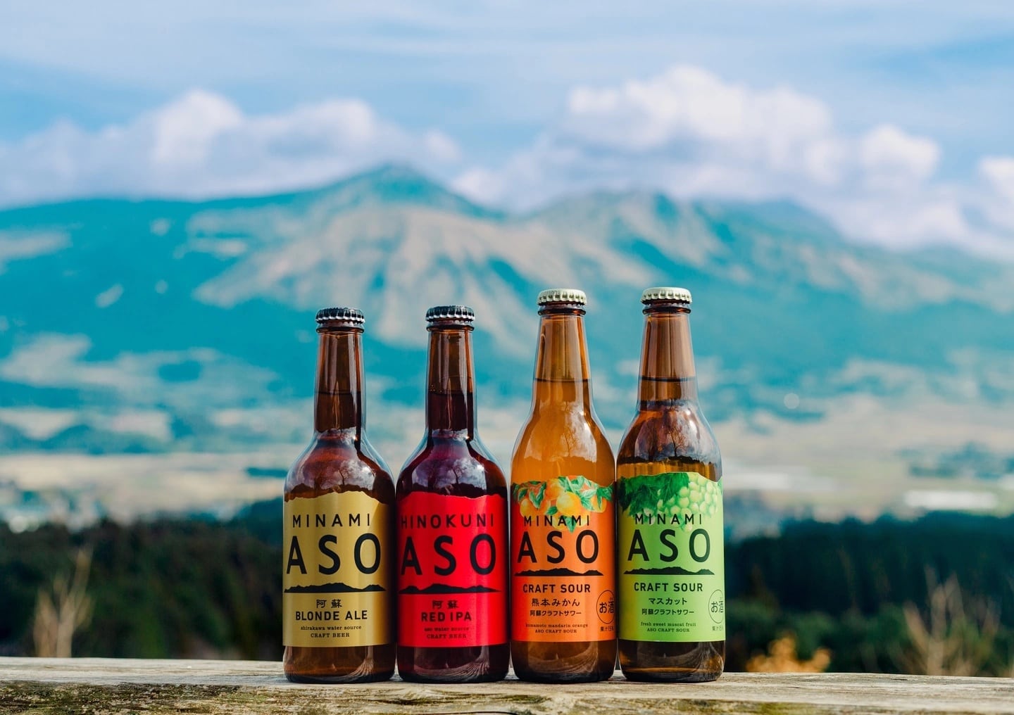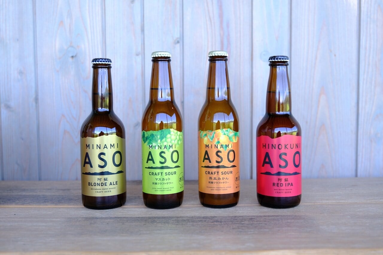 「阿蘇ブロンドエール」「阿蘇レッドIPA」「阿蘇クラフトサワー熊本みかん」「阿蘇クラフトサワーシャインマスカット」の飲み比べセットです。