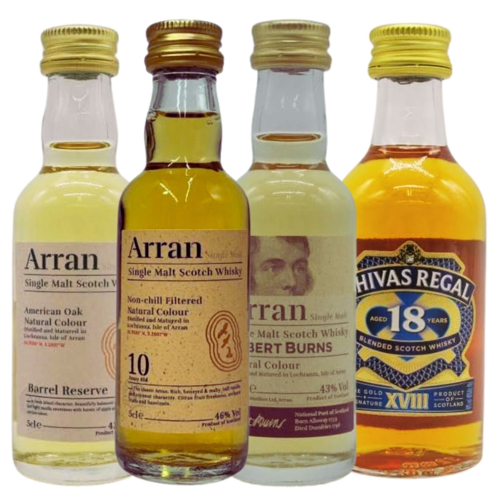 アラン10年(Arran 10 Year Old)、バレルリザーブ(Arran Barrel Reserve)、ロバートバーンズ(Arran Robert Burns)、シーバスリーガル18年(Chivas Regal 18 Year Old)のミニボトルが各1本ずつ入った飲み比べセット。世界でも人気のウィスキーを気軽にご自宅で堪能できます。