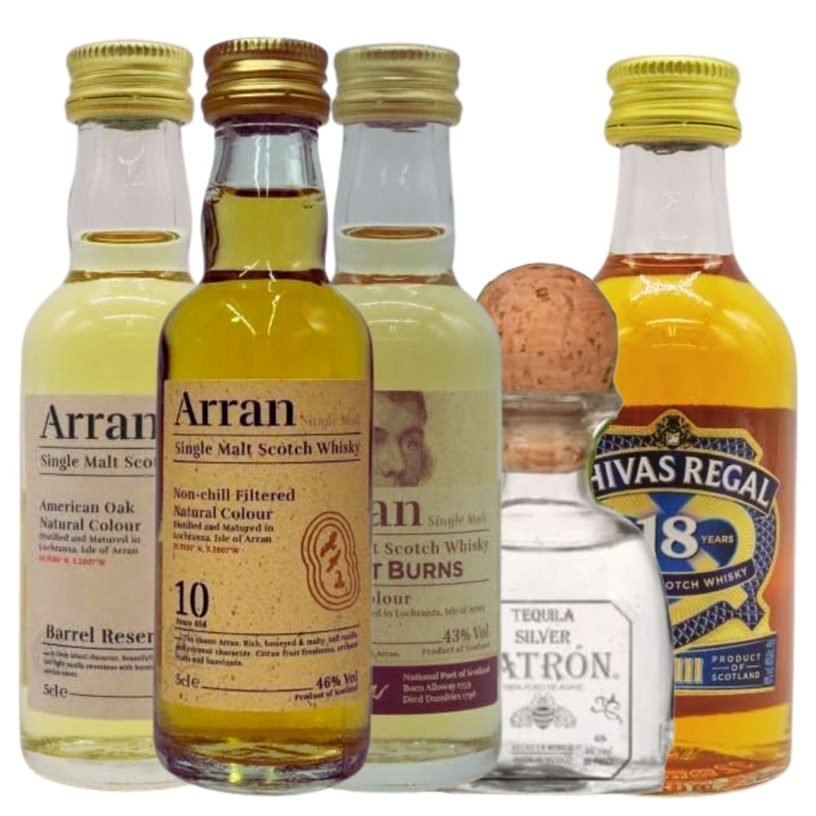 【5本セット】ミニチュア ウイスキー&テキーラ 飲み比べ アラン10年 / バレルリザーヴ / ロバートバーンズ / シーバスリーガル18年 / パトロンシルバー 50ml×5本 シングルモルト ブレンデッド スコッチウイスキー プレミアムテキーラ ミニボトル テイスティング お試し 高級 洋酒 Whiskey TEQUILA