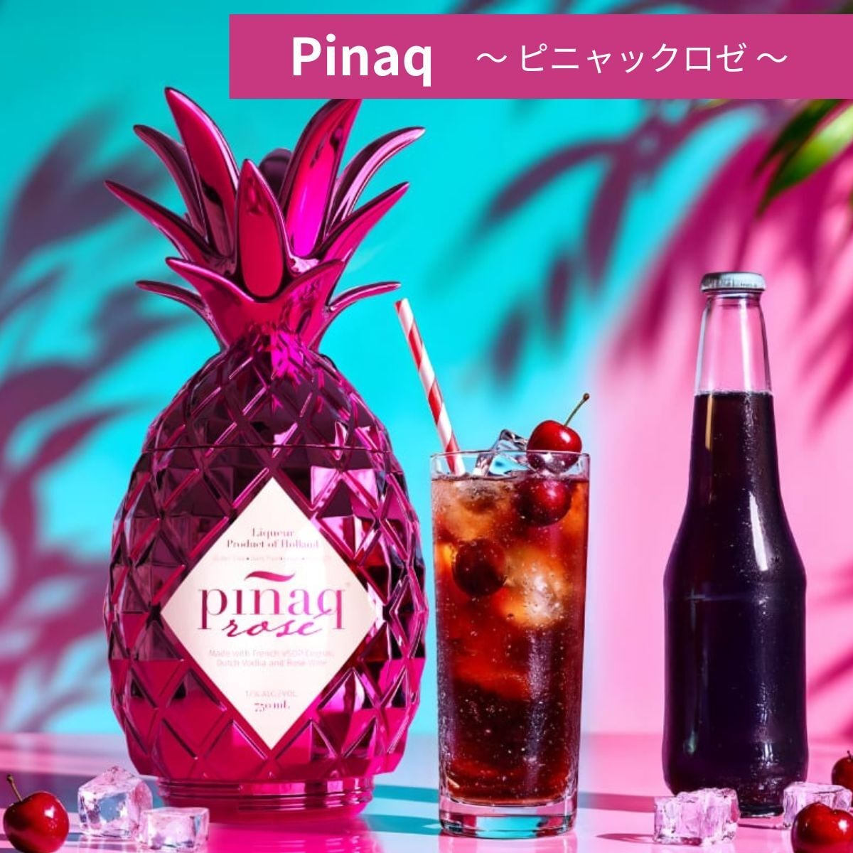 「ピニャック ロゼ」は、トロピカルフレーバーと印象的なパイナップル型ボトルで知られるプレミアムリキュールブランド『Piñaq(ピニャック)』が誇る代表作。南国フルーツの爽やかな香りと美しいロゼカラーが特徴的な、高級トロピカルリキュールです。メタリックが煌めく華やかな見た目も大人気で、世界各地で人気を集めています。