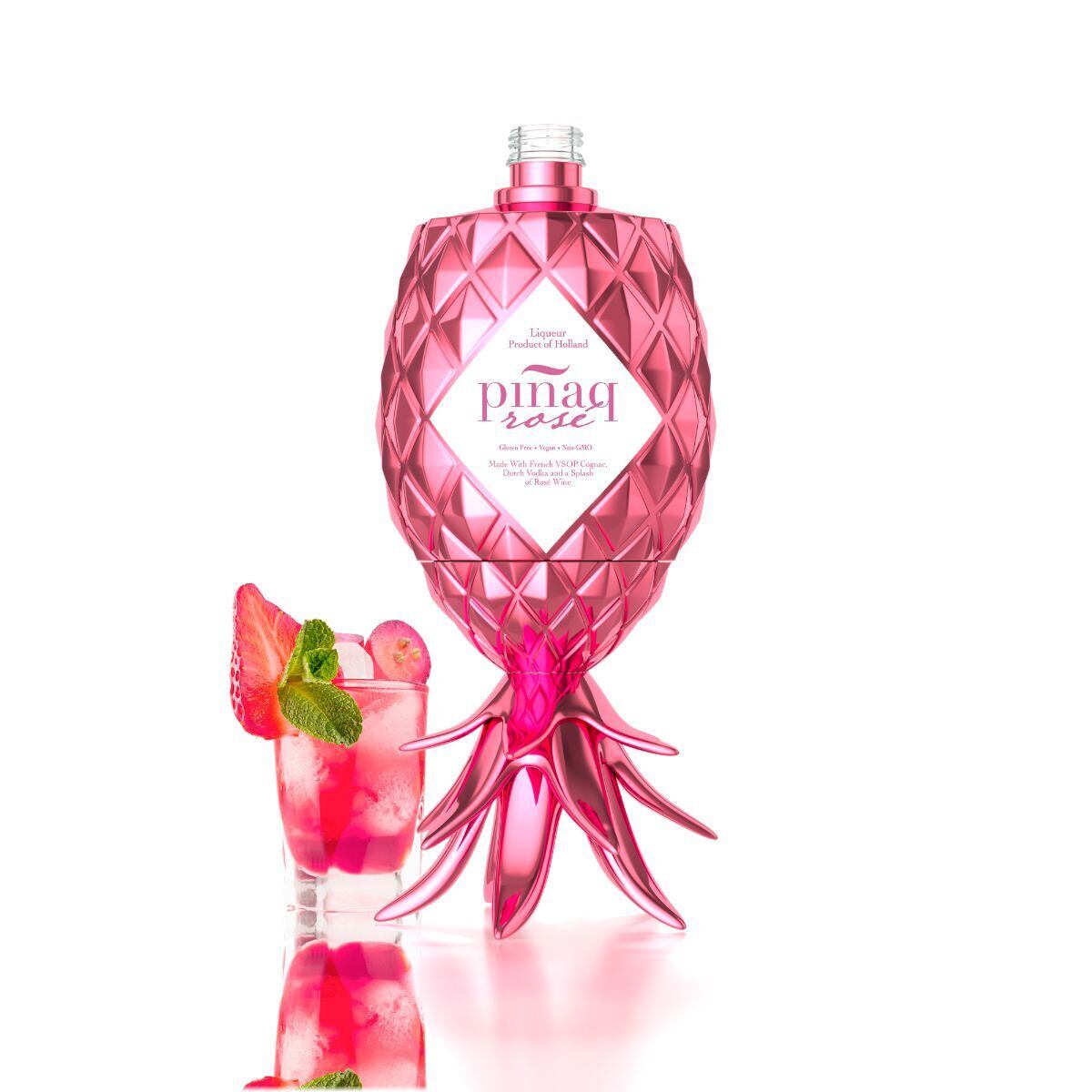 「ピニャック ロゼ」は、トロピカルフレーバーと印象的なパイナップル型ボトルで知られるプレミアムリキュールブランド『Piñaq(ピニャック)』が誇る代表作。南国フルーツの爽やかな香りと美しいロゼカラーが特徴的な、高級トロピカルリキュールです。メタリックが煌めく華やかな見た目も大人気で、世界各地で人気を集めています。